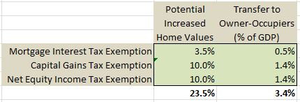 In terms of its effect on the housing market, if we assume a 20% capital gains tax rate and 75% utilization of the exemption, the value of a home increases by about 10% at today's interest rates. Since owner-occupier rent represents about 14% of GDP, this amounts to an annual transfer of about 1.4% of GDP from renters to owners.